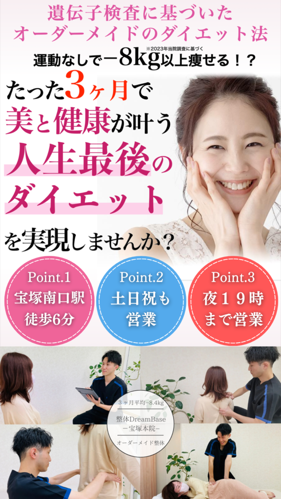 ダイエットのプロとしての証である資格を保有し、数多くのお客様から支持され、あなたの悩みに真正面から向き合う、整体DreamBase–宝塚本院–に来院し、健康と美容の先にある理想の自分を叶えて心から思いっきり楽しめる人生を手に入れる道。